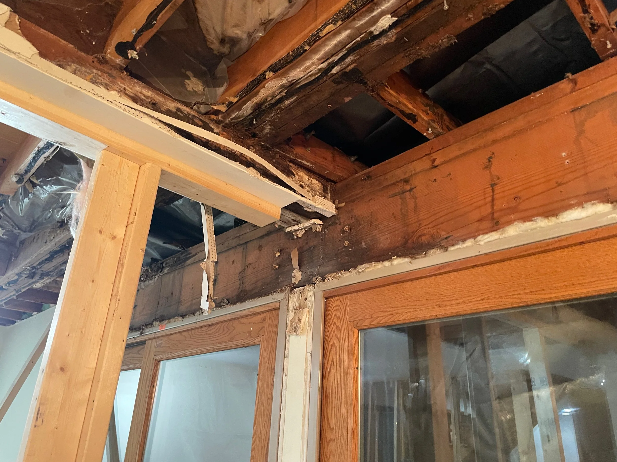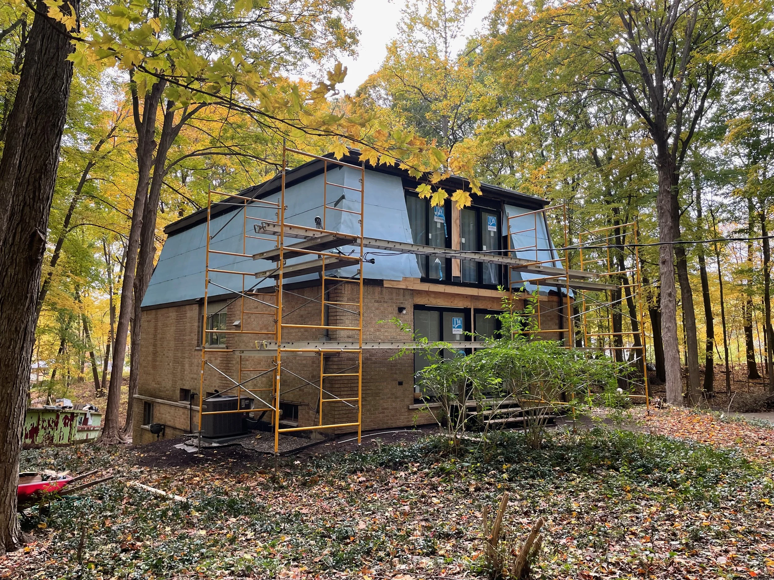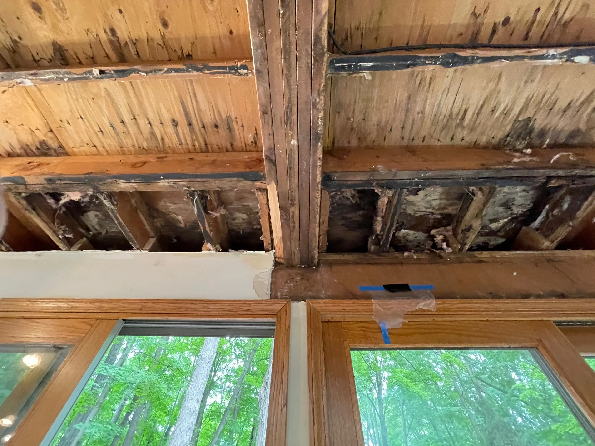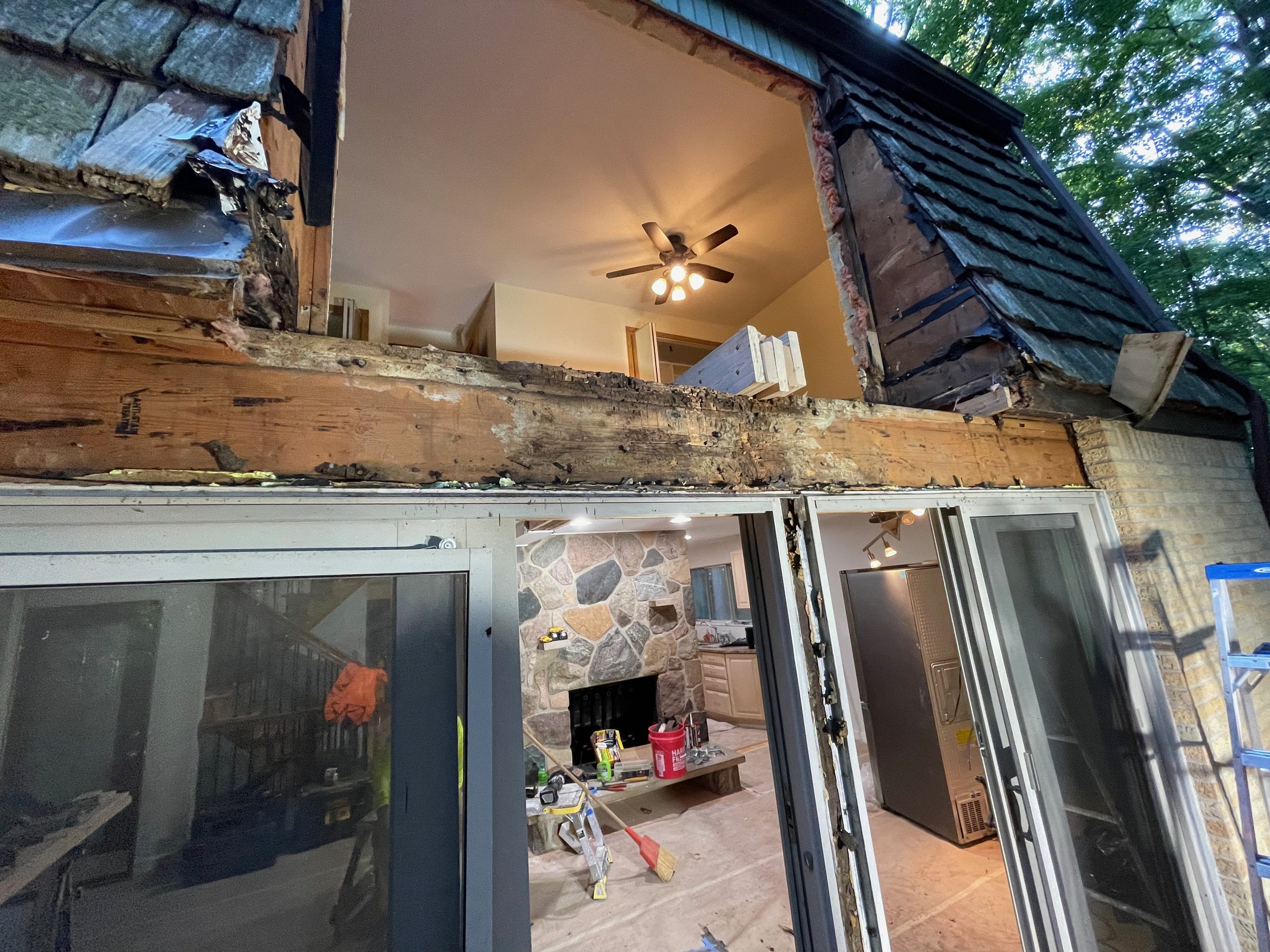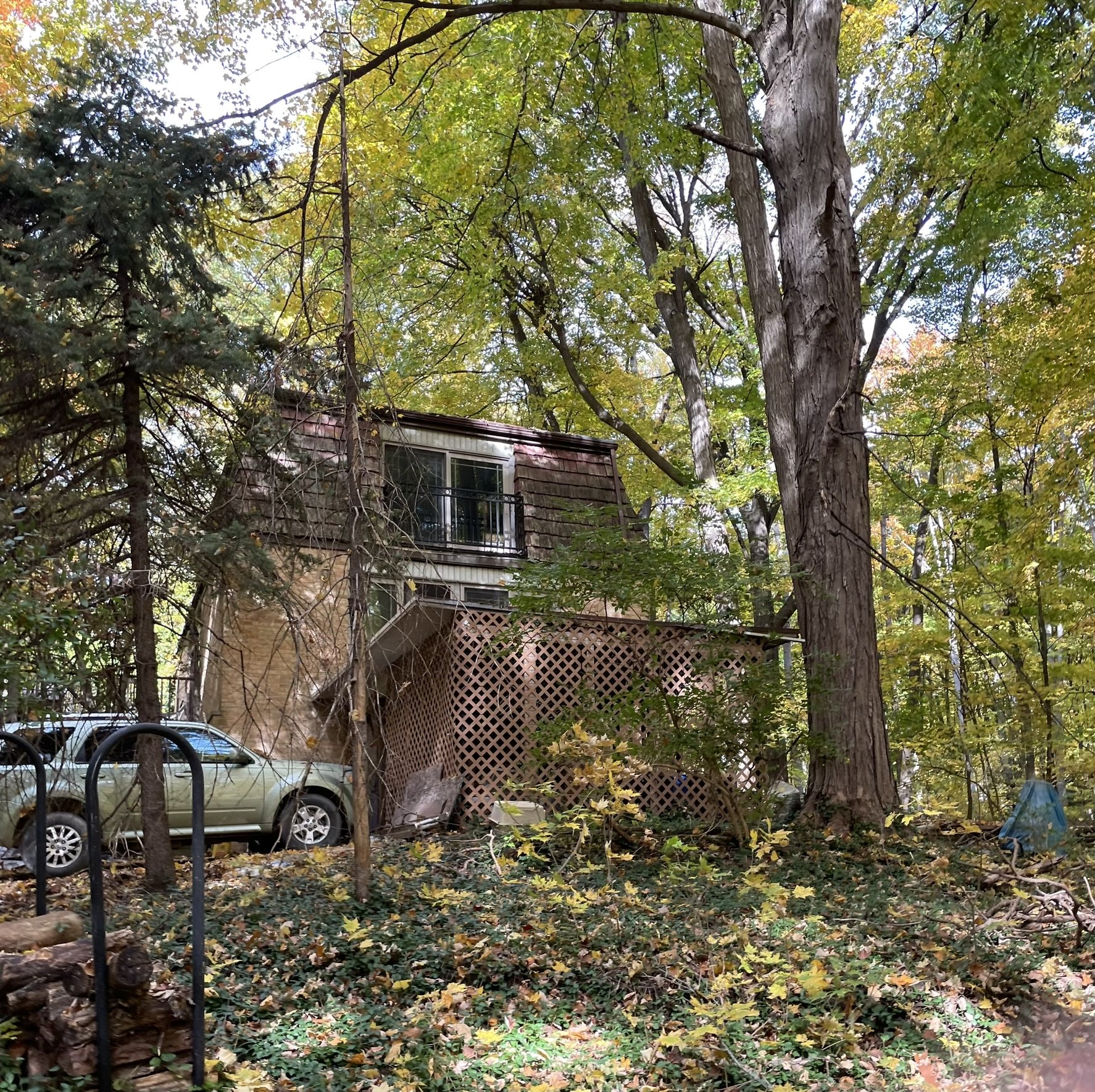 As the woods closed in, the flat roof and “Juliet” balconies created openings that allowed water to enter and compromise the supports, floors and foundation. The unmaintained cedar shake patinated to green moss and English Ivy as thick as a finger established throughout.
